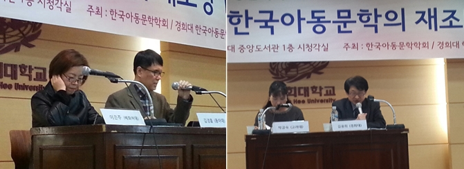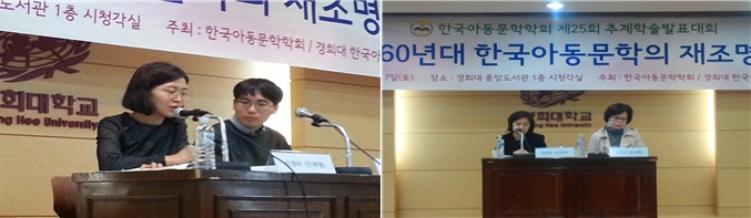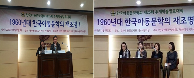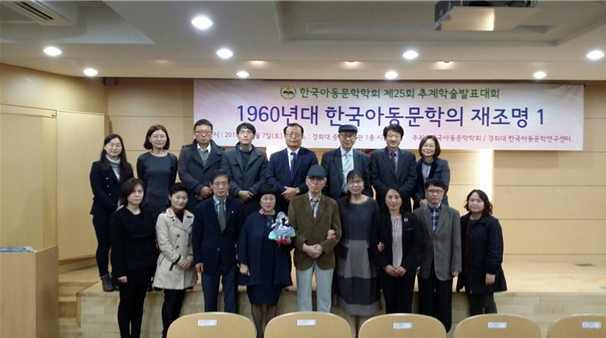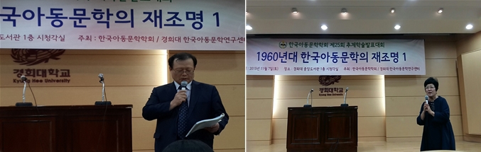 -한국아동문학학회 추계학술대회- 한국아동문학회에서는 경희대학교 한국아동문학연구센터와 공동으로 2015년 11월 7일(토) 경희대학교 중앙도서관 시청각실에서「1960년대 전기 한국아동문학의 재조명」이라는 주제로 2015년 추계학술대회를 개최하였다. 박상재 한국아동문학학회 회장은 인사말을 통해 창립 27년이 되는 전통 있는 학회에서 강소천 동화에 발현된 아동심리와 성장모티브, 최효섭 초기 장편동화 연구, 분단 고착화에 대한 경각과 통일에의 환기, 1960년대 초기 아동문학에 나타난 시대의식 등의 발표를 통해 60년대 전기 한국아동문학의 양상을 심도 있게 탐색하고 조명하게 된 중요한 자리라는 점에 의의가 있다고 밝혔다. 원로 아동문학가 신현득 시인은 한국아동문학의 발전을 위해 여러 작가들의 헌신과 함께 한국아동문학 연구를 위해 한평생을 바친 사계 이재철 박사의 공과 업적을 기리며 더욱 성숙하고 발전하는 학회가 되어 줄 것을 당부하였다.